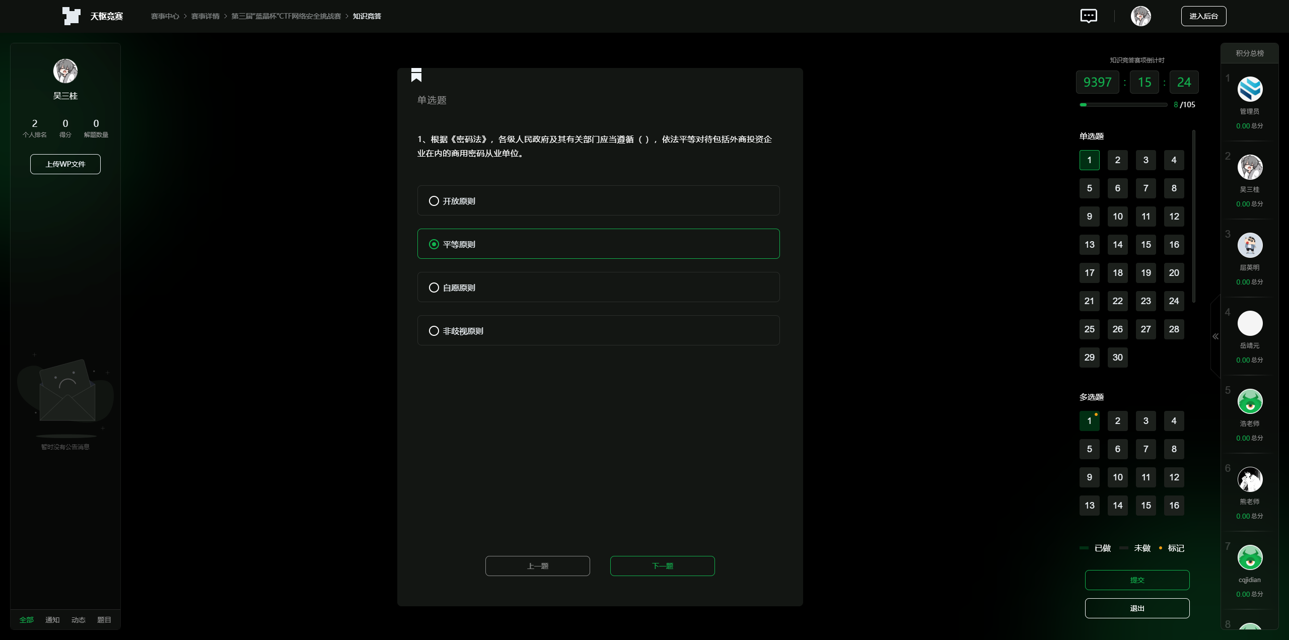 系统深入监控各团队和选手的具体操作进度与实时得分情况。管理员甚至可对未交卷的选手直接执行“强制交卷”操作,确保比赛节奏完全可控。