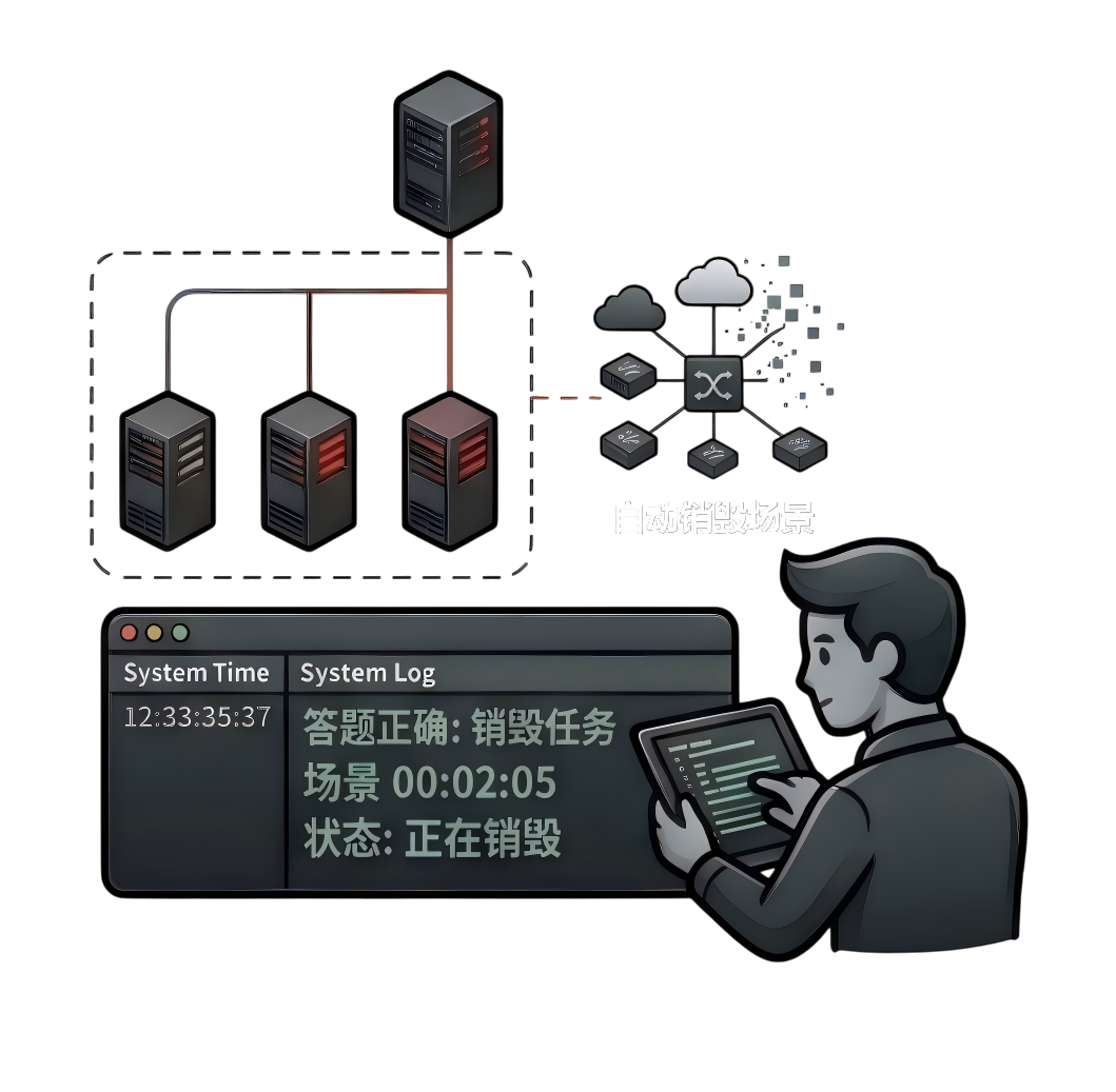 与虚拟仿真引擎深度联动。支持容器环境快速导入、复杂网络拓扑可视化搭建。答题正确后自动销毁释放性能,支持选手申请环境时间续签