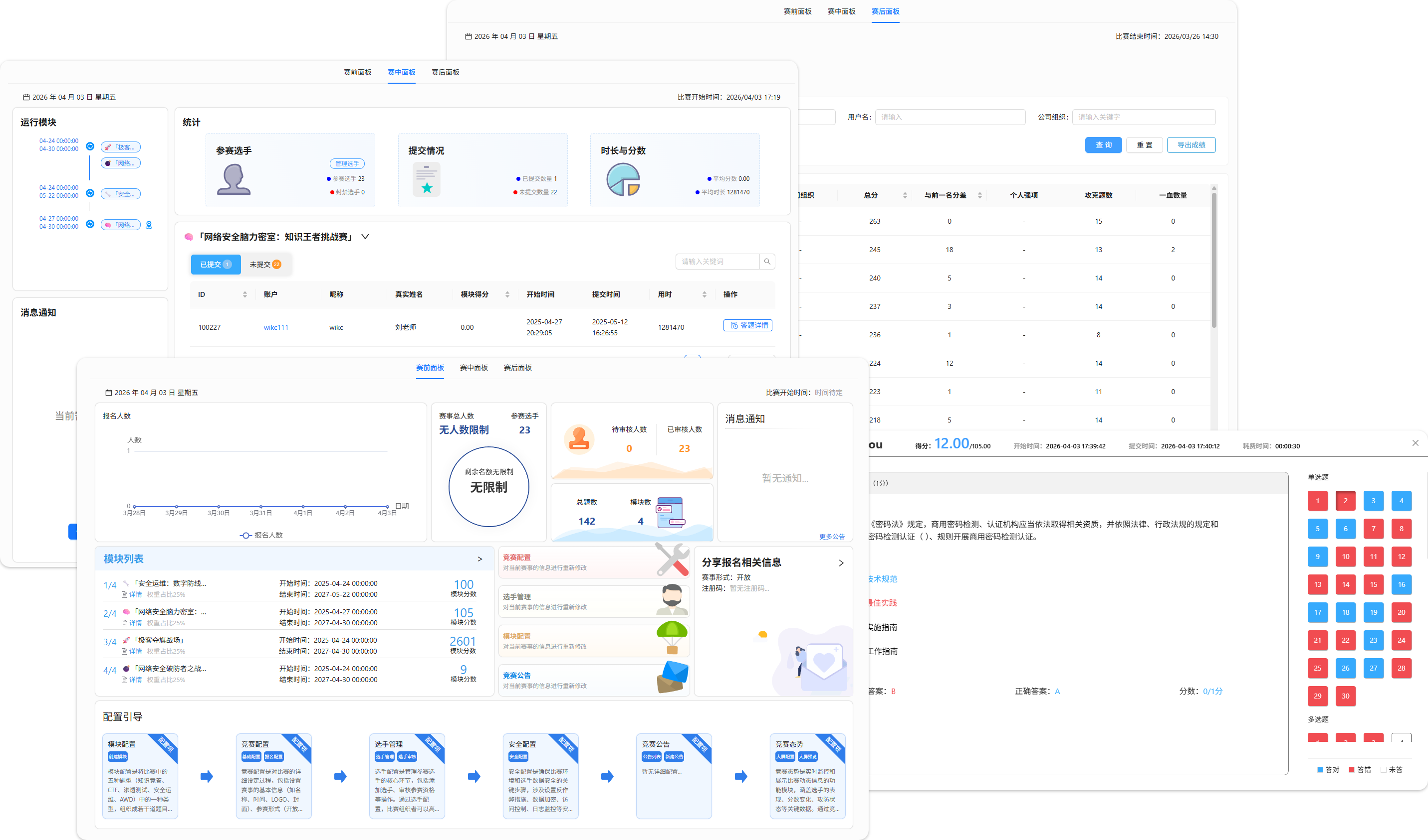 监控面板实时显示当前运行模块、选手答题、设备状态与精准倒计时。这帮助赛事组织者清晰、直观地掌控整个比赛的宏观进展。
