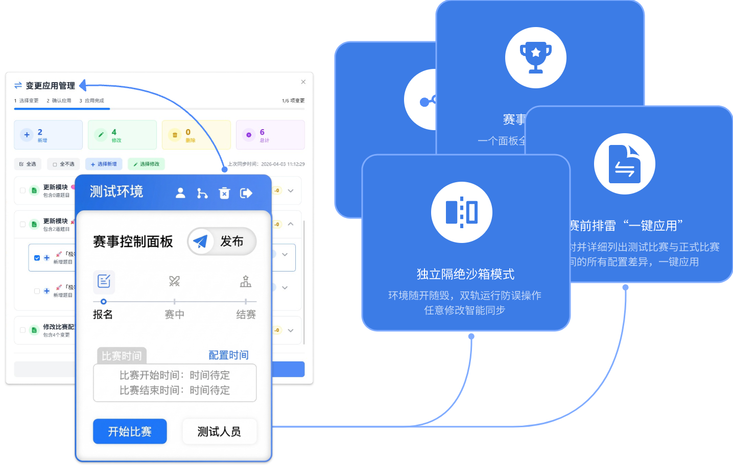 系统会详细列出测试环境与正式比赛之间的所有配置差异,管理员可按项选择并将其一键实时应用到正式比赛中。